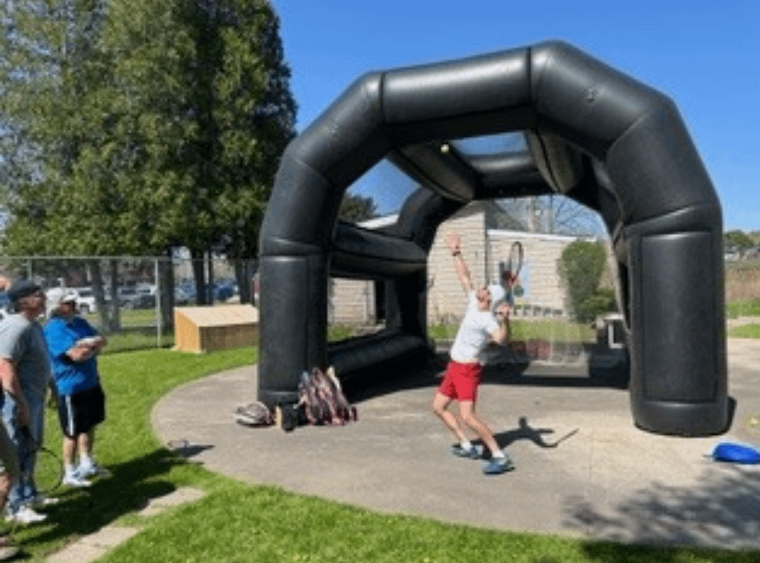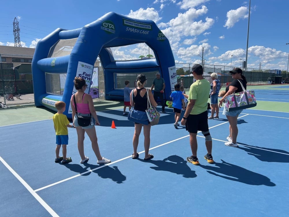 Simon Burden had the National Bank OTA Roadshow smash cage set up on the tennis courts for the party in the park at the conclusion of the parade. It attracted lots of attention and inquiries from families about services and programs at the club.