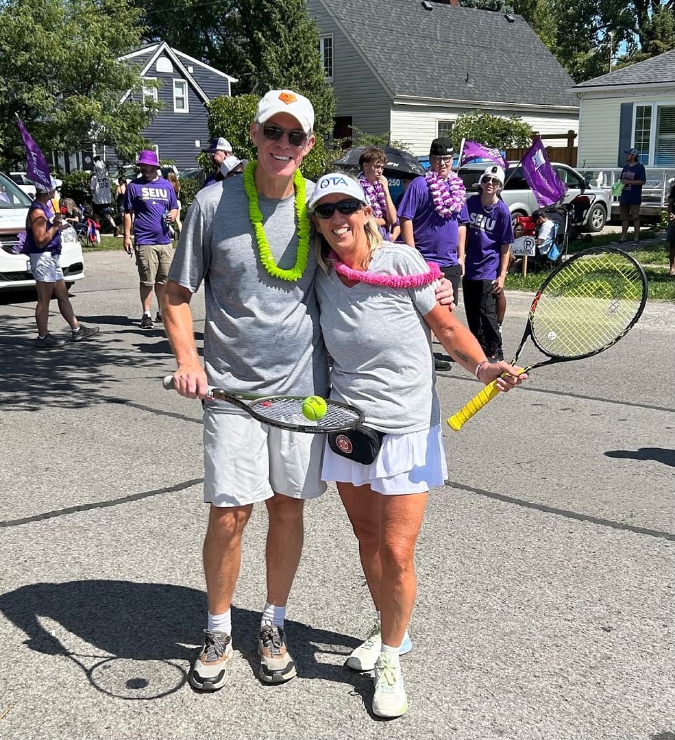 John Pilling and Anne Kravchenko dazzled the spectators along the way, volleying across the road for the entire two kilometre parade route. Club president Chris Richard anchored the group in his truck, while Onur Erginer, Leanne Richard and Larry Greenspan shelled out treats as well as shirts to the kids who joined in the volley fun. Larry added to the tennis-is-for-vitality impression by travelling on roller blades.