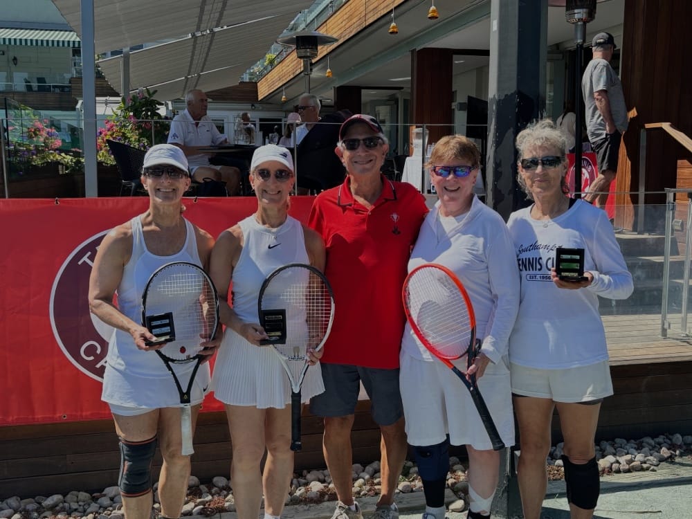 Diana and her partner Lee Myers (who is from SouthamptonTC) won the women’s doubles in both 60+ and 65+ divisions. They’re on the right in the featured photo above, with Irwin Tobias in the centre, and twin sisters Paula Barsky and Francine Bishinsky on the left. Diana was happy to credit Charlotte (Petrick) Hawswell with some helpful playing lessons at the Niagara-on-the-Lake TC in preparation for the tournament.