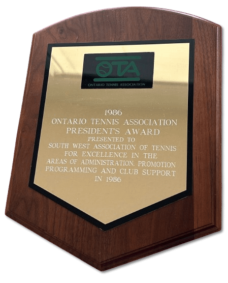 Presented to SouthWest Association of Tennis for excellence in the areas of administration, promotion, programming and club support in 1986.